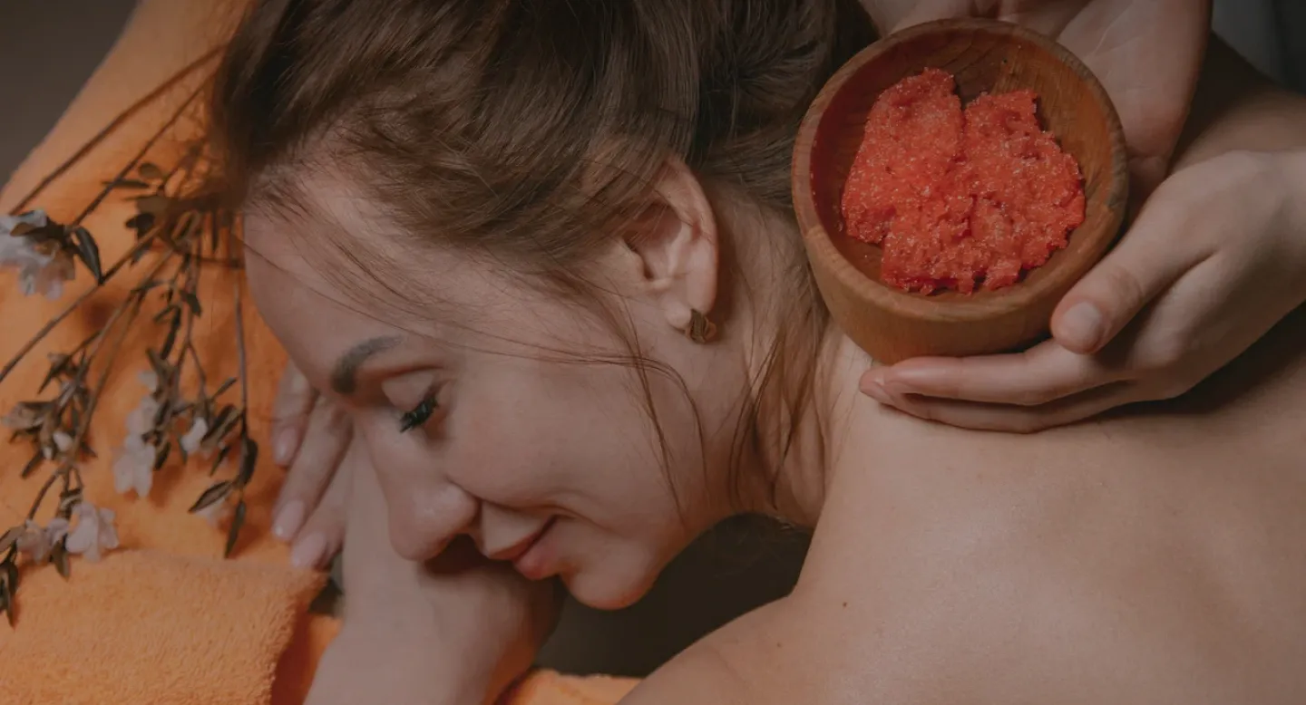 Мастер круговыми движениями наносит скраб на тело, а отшелушивающий эффект обспечивает вишневая косточка, в результате кожа очищается, организм насыщается полезными микроэлементами наряду с приятными тактильными ощущениями